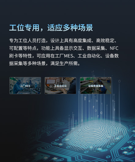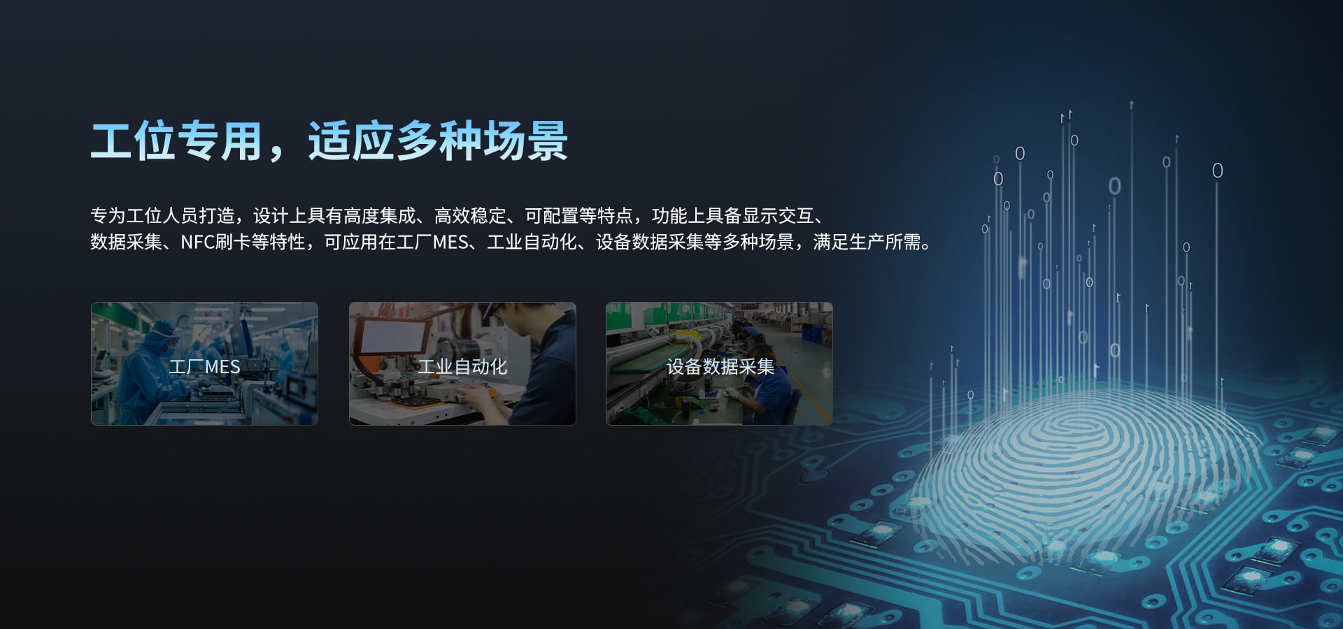 专为工位人员打造,设计上具有高度集成、高效稳定、可配置等特点,功能上具备显示交互、数据采集、NFC刷卡等特性,可应用在工厂MES、工业自动化、设备数据采集等多种场景,满足生产所需。