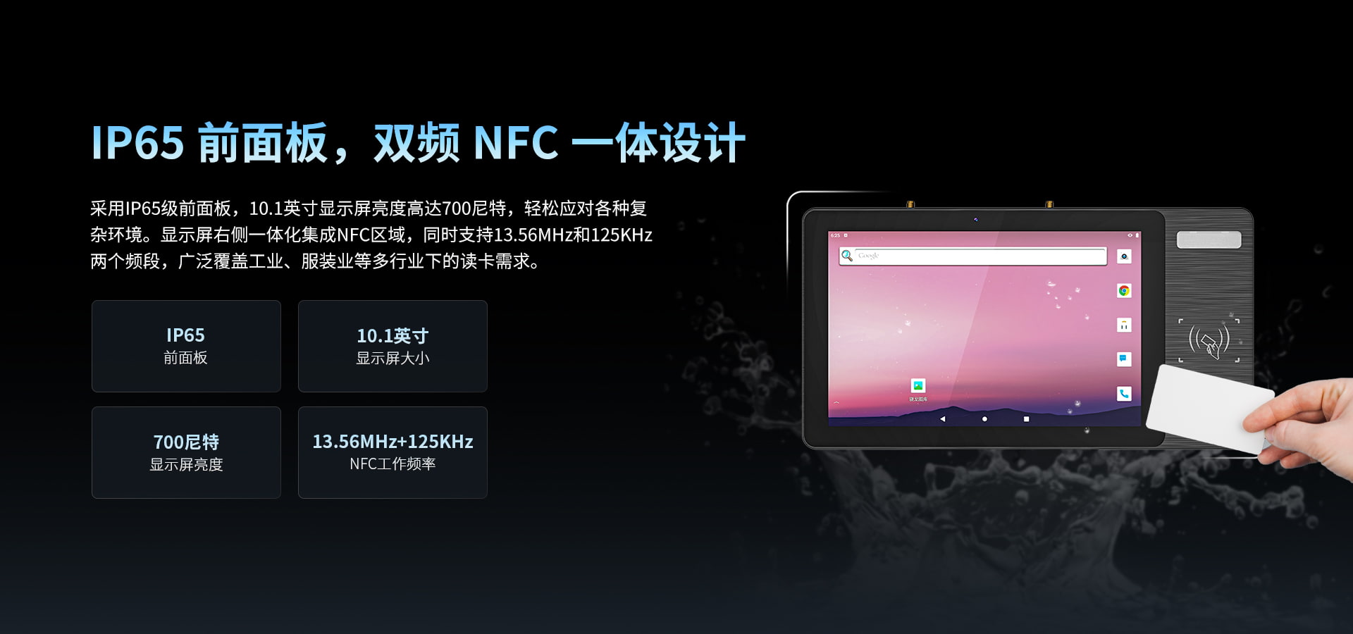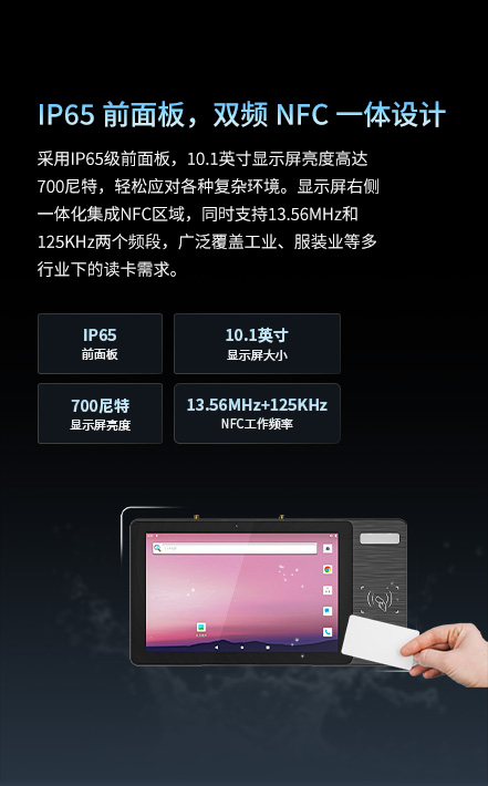 采用IP65级前面板,10.1英寸显示屏亮度高达700尼特,轻松应对各种复杂环境。显示屏右侧一体化集成NFC区域,同时支持13.56MHz和125KHz两个频段,广泛覆盖工业、服装业等多行业下的读卡需求。