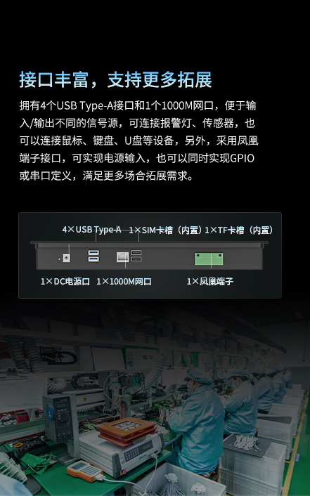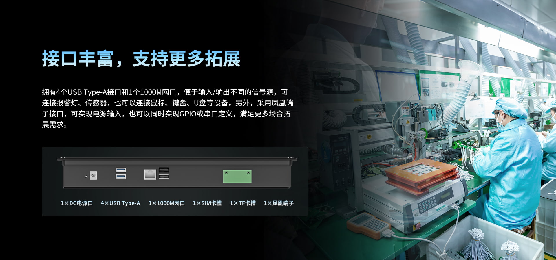 拥有4个USB Type-A接口和1个1000M网口,便于输入/输出不同的信号源,可连接报警灯、传感器,也可以连接鼠标、键盘、U盘等设备,另外,采用凤凰端子接口,可实现电源输入,也可以同时实现GPIO或串口定义,满足更多场合拓展需求