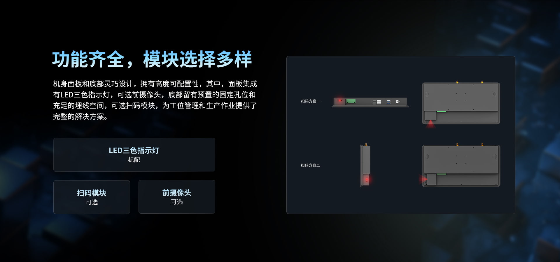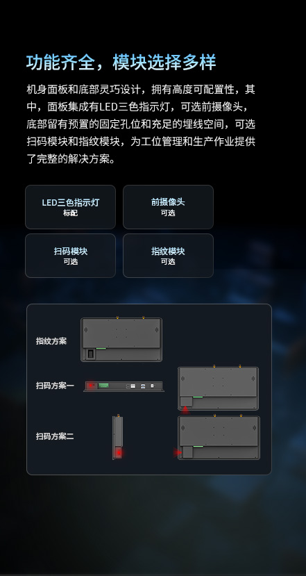机身面板和底部灵巧设计,拥有高度可配置性,其中,面板集成有LED三色指示灯,可选摄像头或人脸识别摄像头,底部留有预置的固定孔位和充足的埋线空间,可选扫码模块和指纹模块,为工位管理和生产作业提供了完整的解决方案。