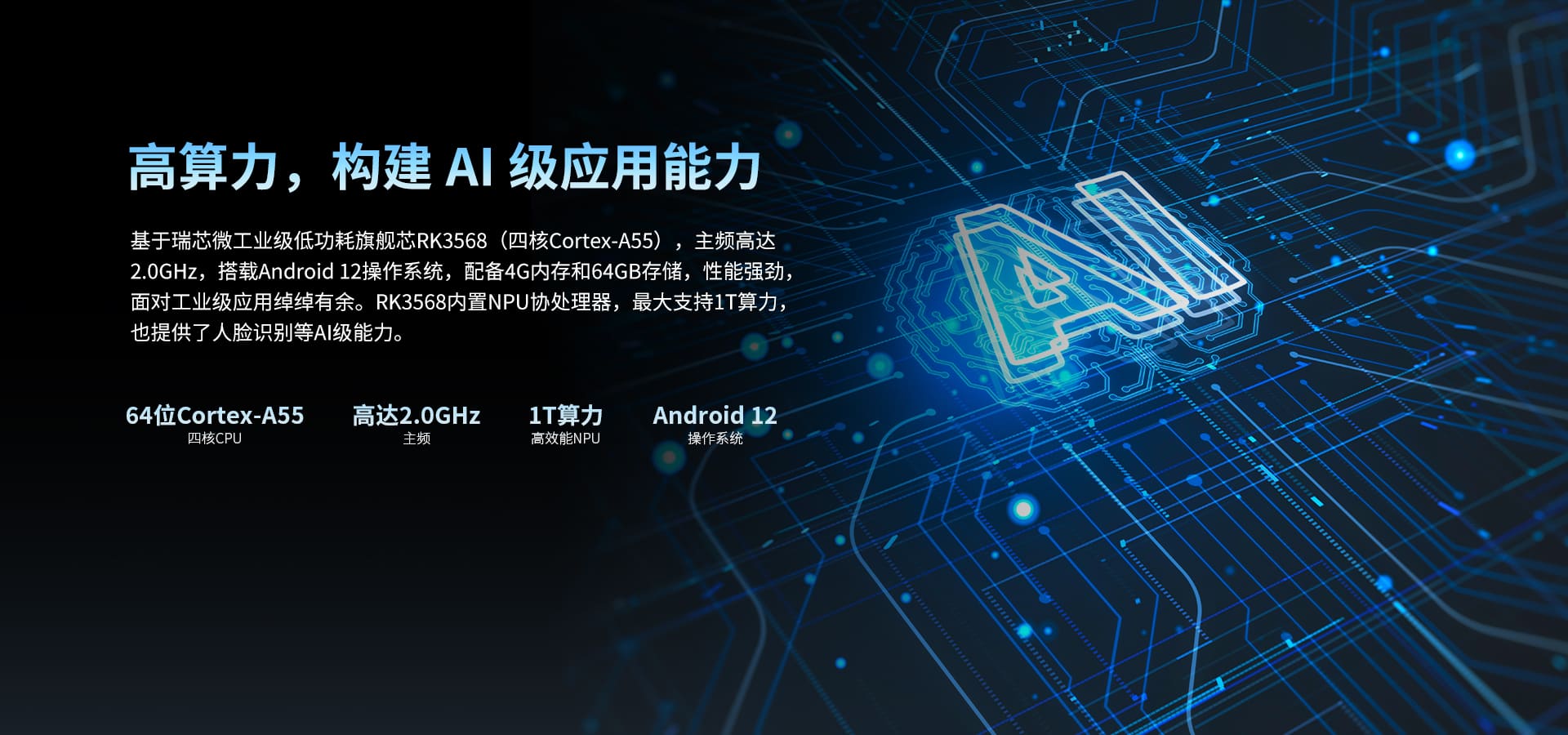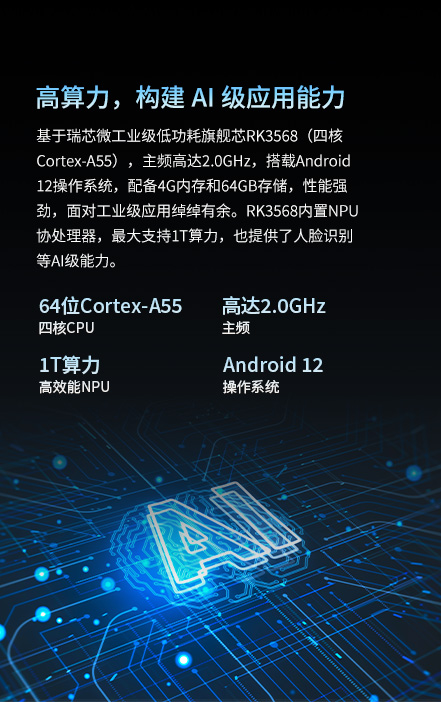 基于瑞芯微工业级低功耗旗舰芯RK3568(四核Cortex-A55),主频高达2.0GHz,搭载Android 12操作系统,配备4G内存和64GB存储,性能强劲,面对工业级应用绰绰有余。RK3568内置NPU协处理器,最大支持1T算力,也提供了人脸识别等AI级能力。