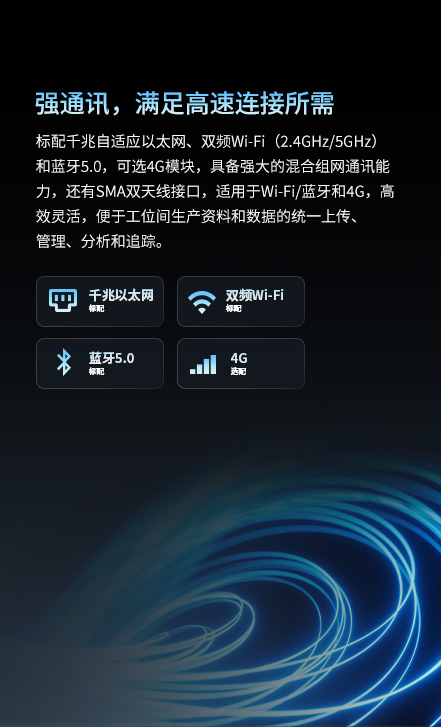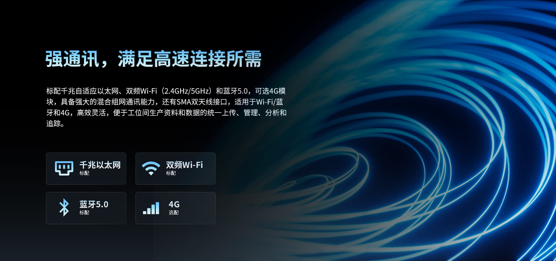 标配千兆自适应以太网、双频Wi-Fi(2.4GHz/5GHz)和蓝牙5.0,可选4G模块,具备强大的混合组网通讯能力,还有SMA双天线接口,适用于Wi-Fi/蓝牙和4G,高效灵活,便于工位间生产资料和数据的统一上传、管理、分析和追踪。