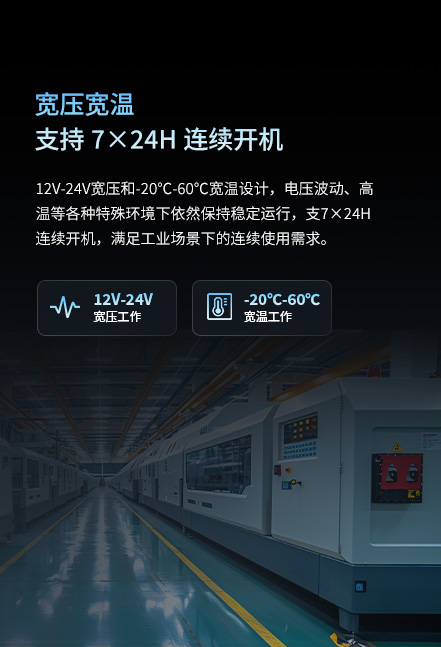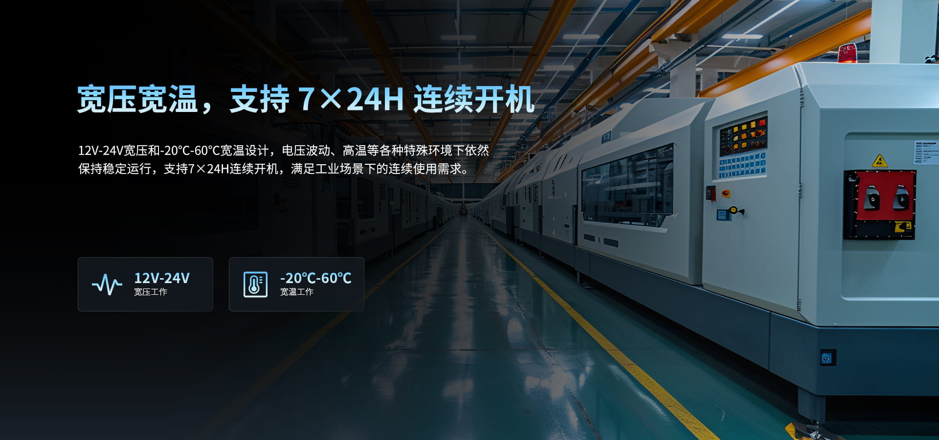 12V-24V宽压和-20℃-60℃宽温设计,电压波动、高温等各种特殊环境下依然保持稳定运行,支持7×24H连续开机,满足工业场景下的连续使用需求。