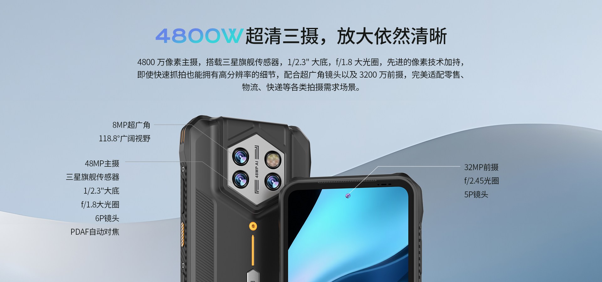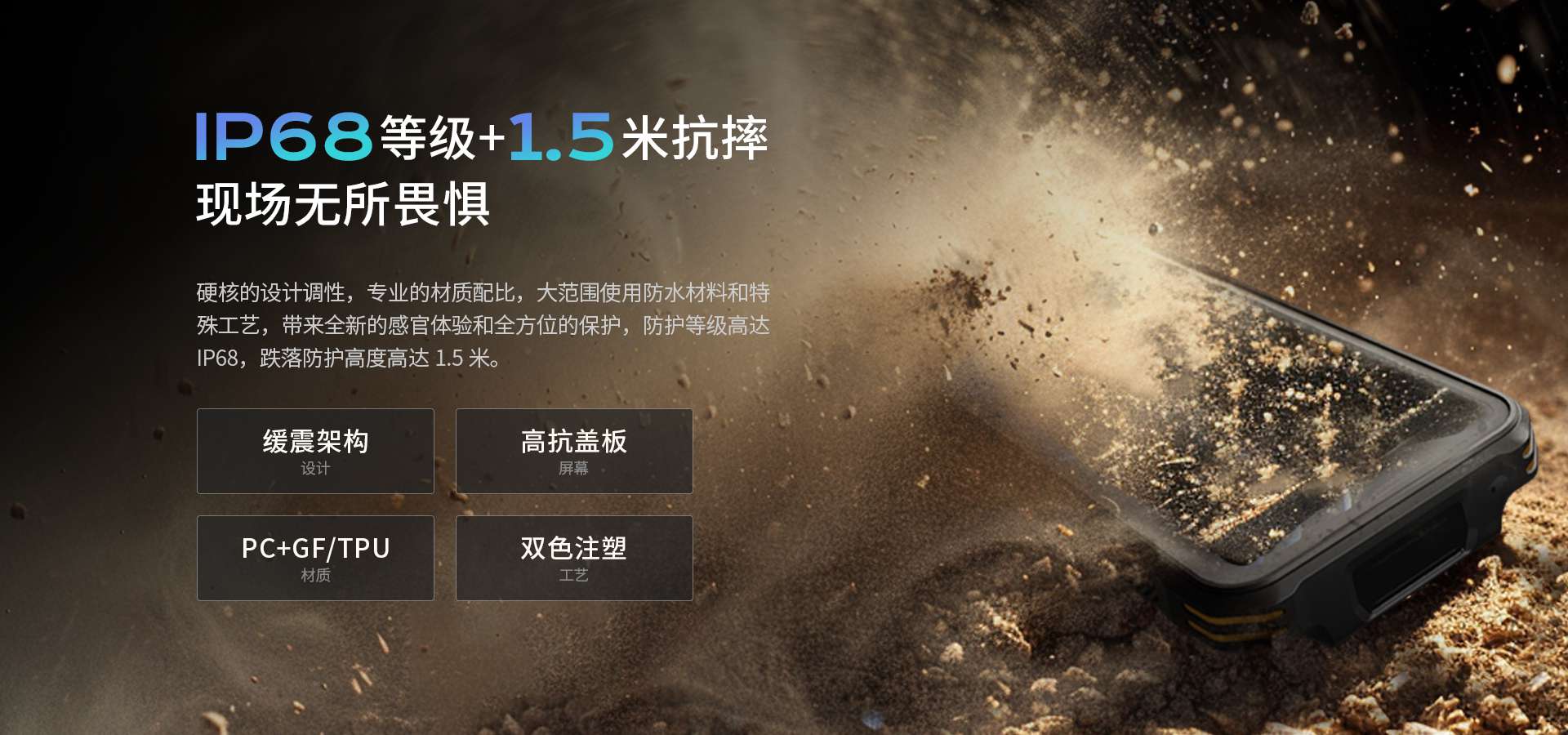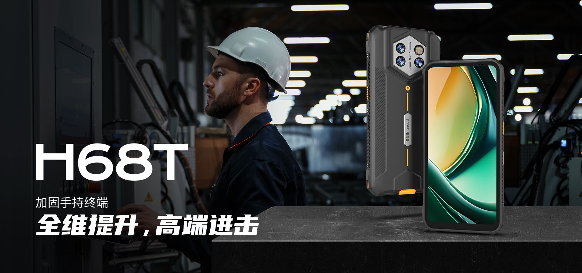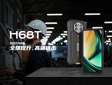 H68T搭载Helio G99平台,最新Android 14系统强力驱动; 6.56英寸新incell旗舰屏,支持多点触控、湿手及手套触控; 顶部集成一维/二维条码扫描引擎,读取范围最高可达10米; 前置3200万像素,后置4800万像素,主摄搭载三星旗舰传感器; 5800mAh大电池, 自研电池管理系统, 还可为其它移动设备供电; 高品质大音量扬声器,采用空间感知算法,户外依旧铿锵有力; IP68 防护等级,深水浸泡无压力,跌落防护高度达到1.5m 。