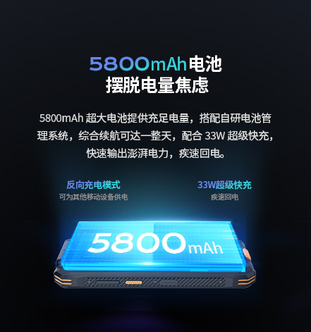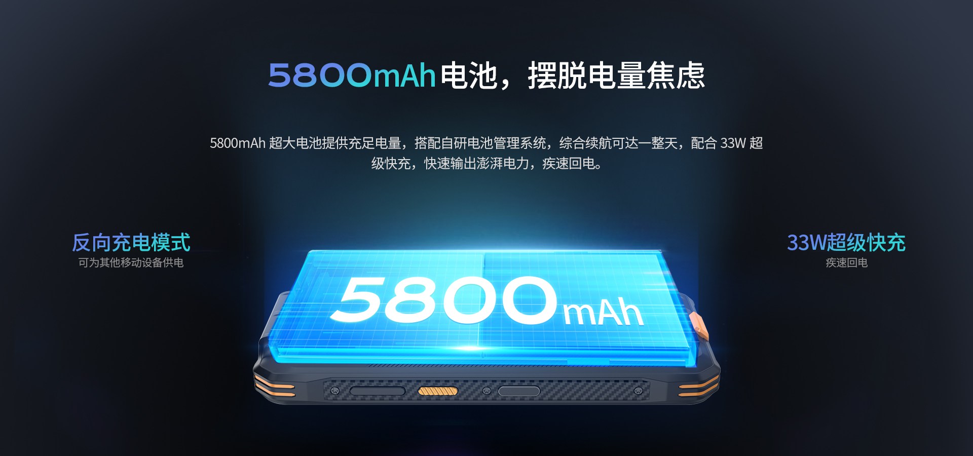 内置5800mAh大电池,支持33W快充,配备自研电池管理系统,还可为其他移动设备供电