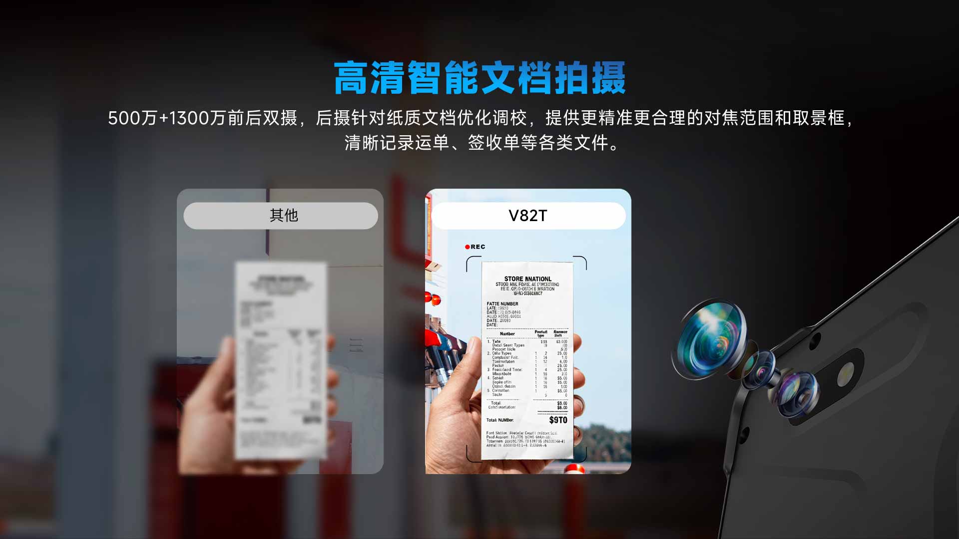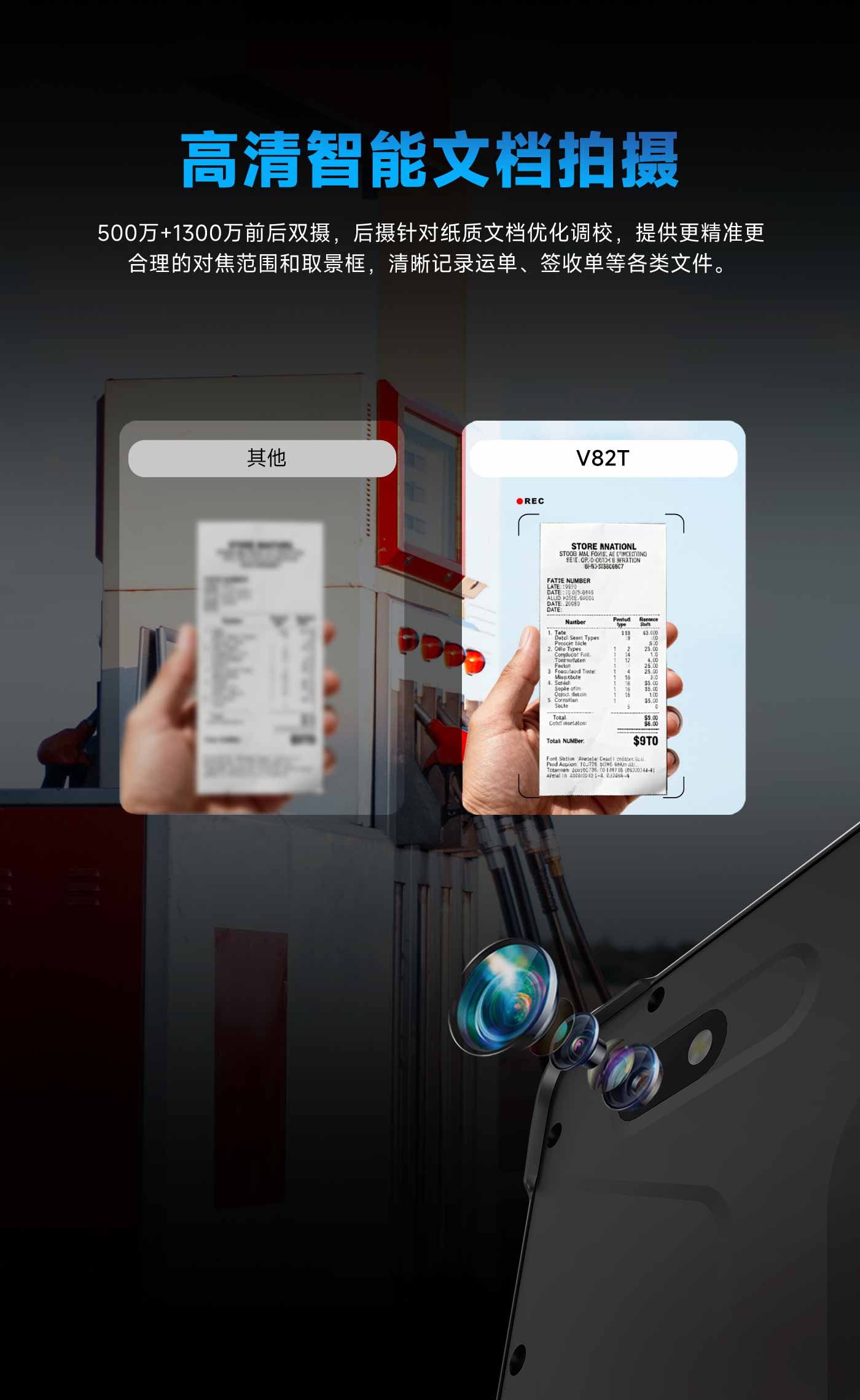 1300万像素后置摄像头,支持自动对焦,可清晰拍摄运单、签收单等各类文档