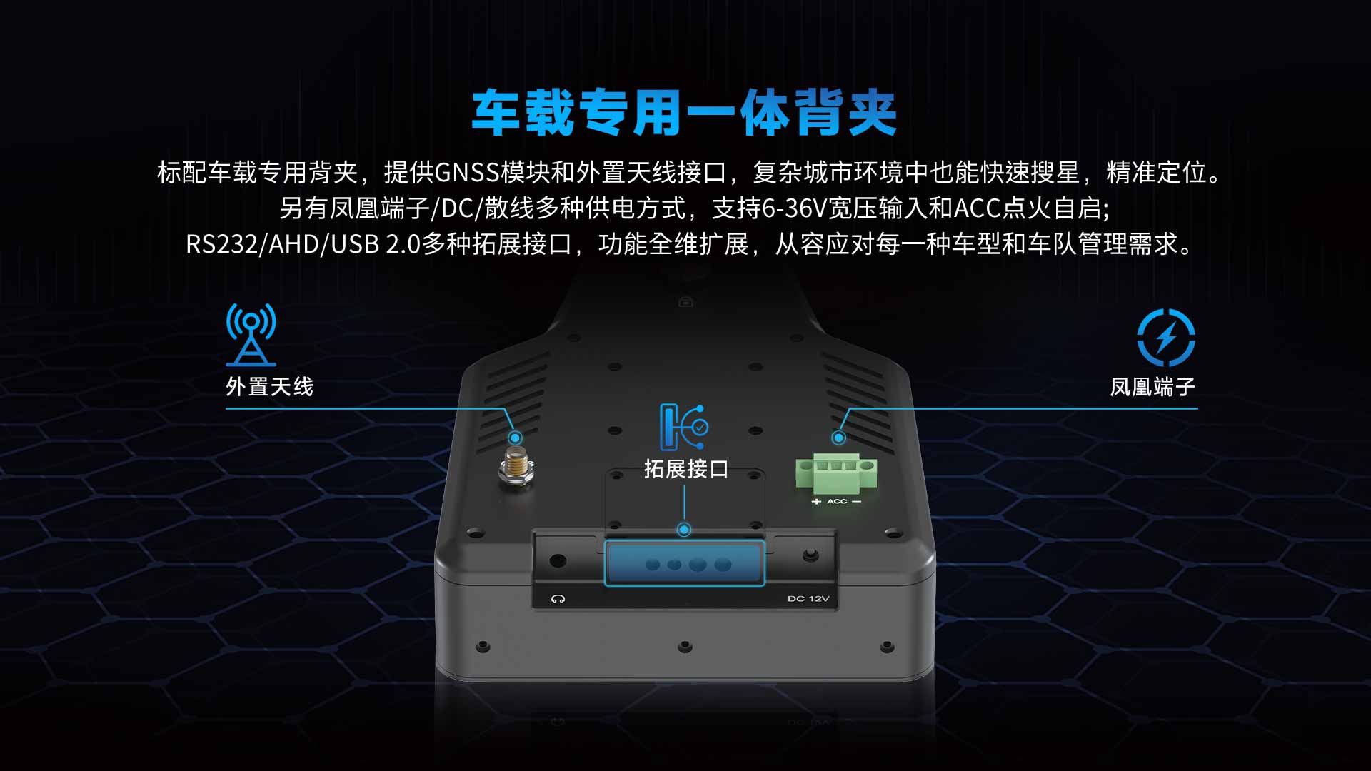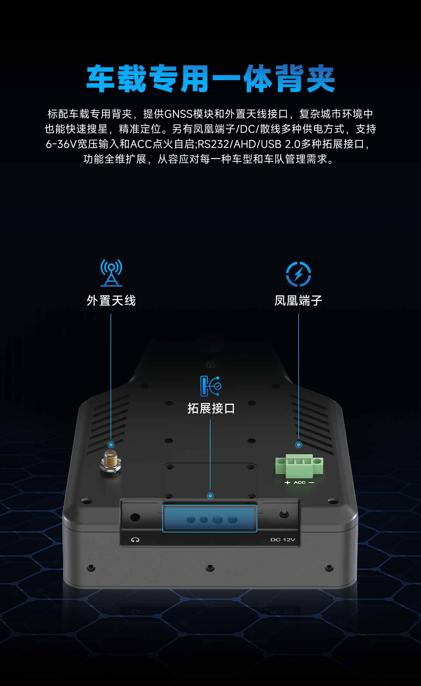 支持6-36V宽压输入和ACC点火自启。搭配多重电池保护机制,行车供电稳定安全。
